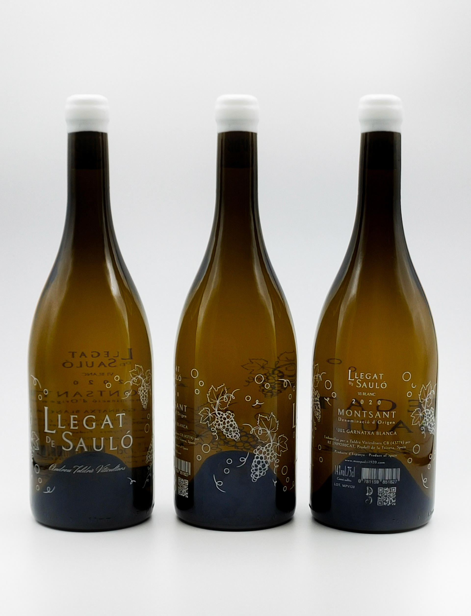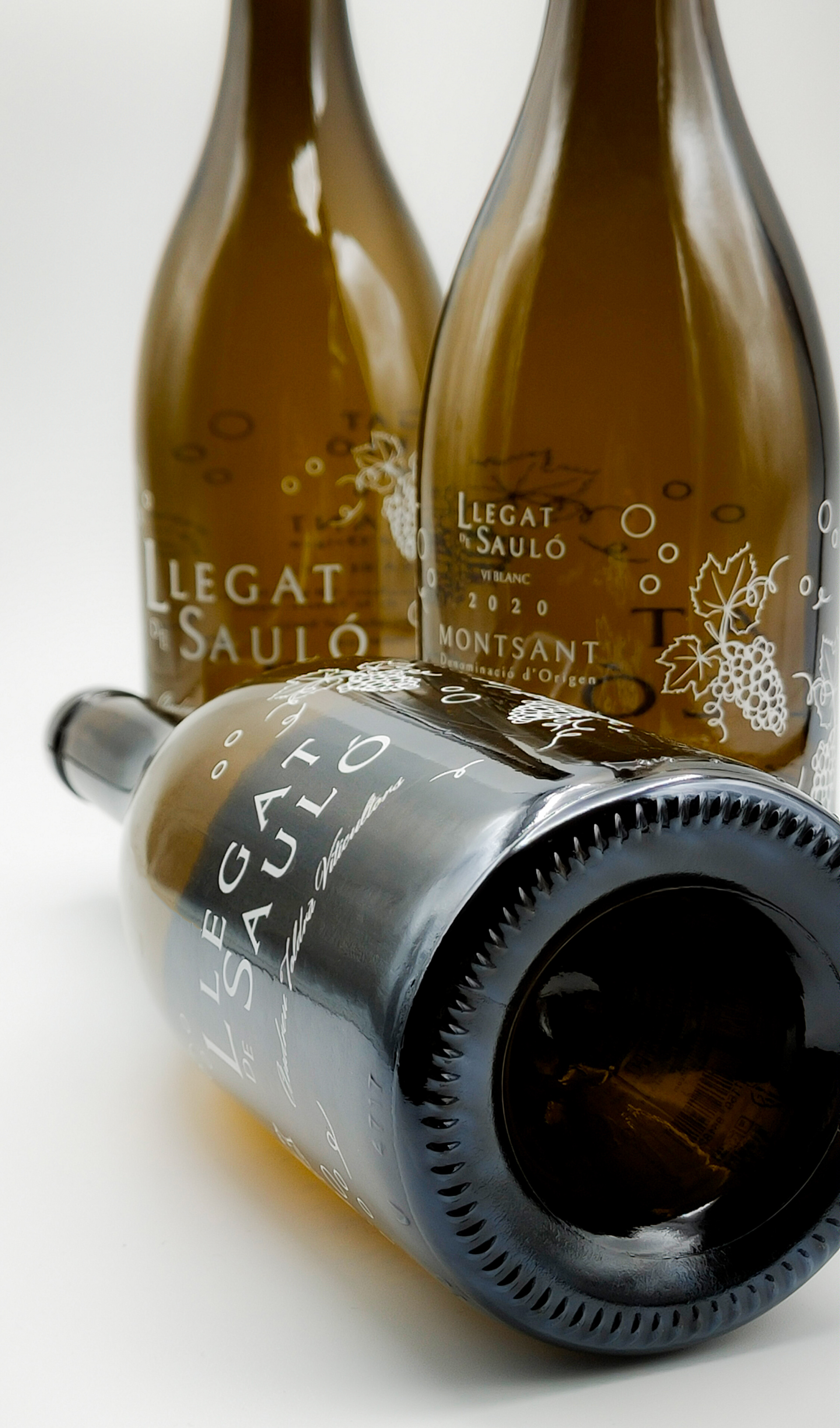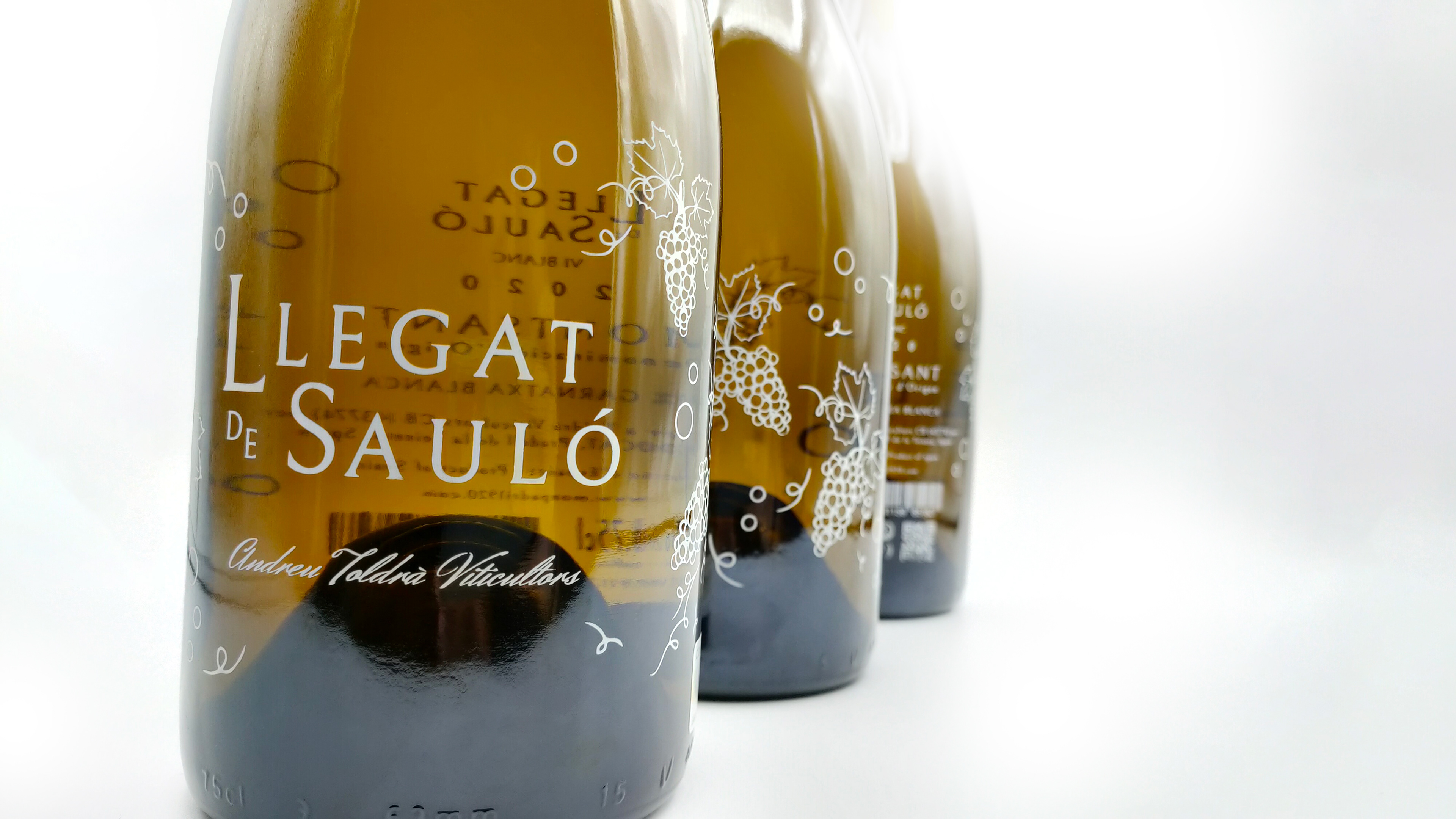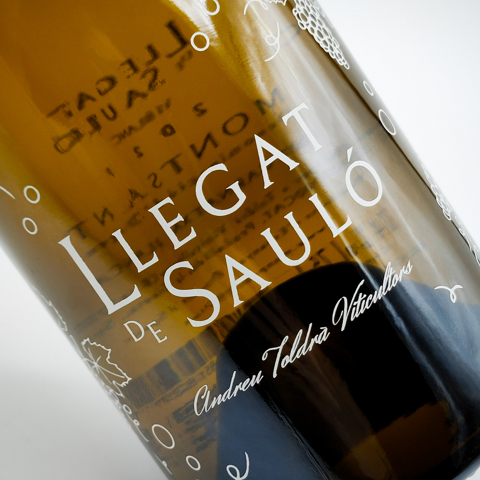 Diseño de marca, logotipo y packaging para Llegat de Sauló, vino blanco con Denominación de Origen Montsant de bodegas Andreu Toldrà Viticultors. Decorado realizado mediante serigrafía vitrificada a un color y a 360º.