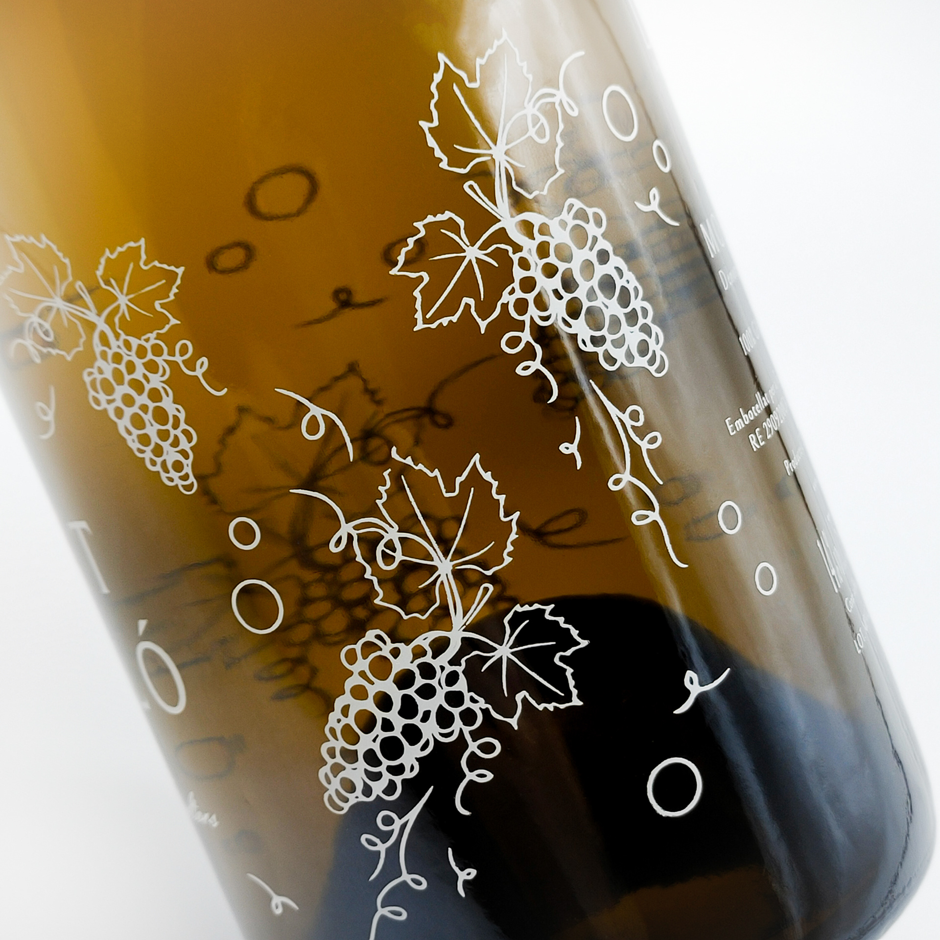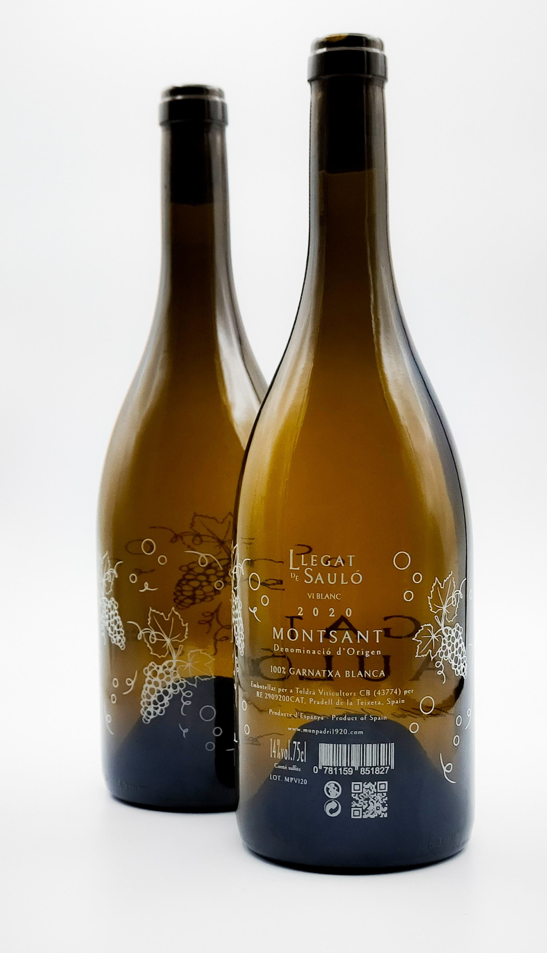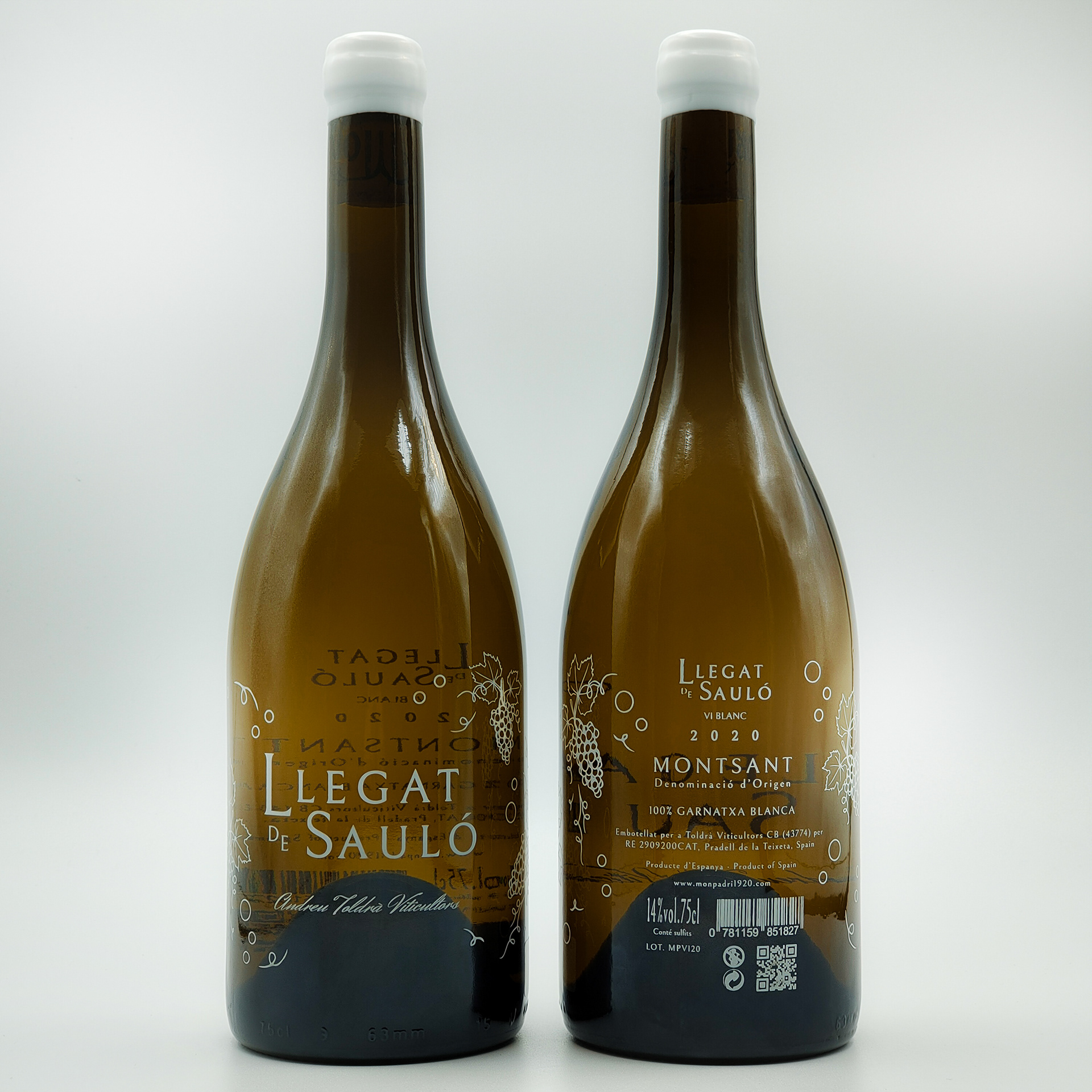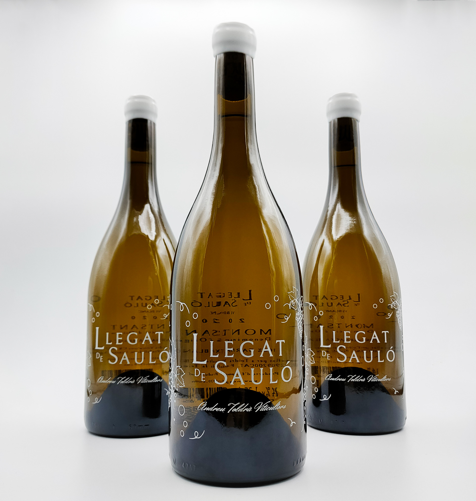Diseño de marca, logotipo y packaging para Llegat de Sauló, vino blanco con Denominación de Origen Montsant de bodegas Andreu Toldrà Viticultors. Decorado realizado mediante serigrafía vitrificada a un color y a 360º.